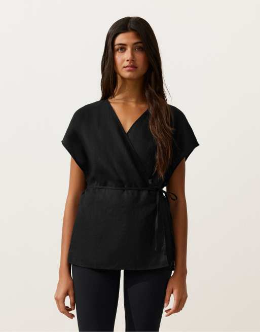 OYSHO – Hemdbluse aus 100% Leinen in Schwarz mit Wickeldesign und Bindegürtel