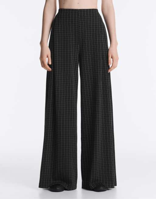 OYSHO – Karierte Pikee-Hose in Schwarz mit weitem Bein