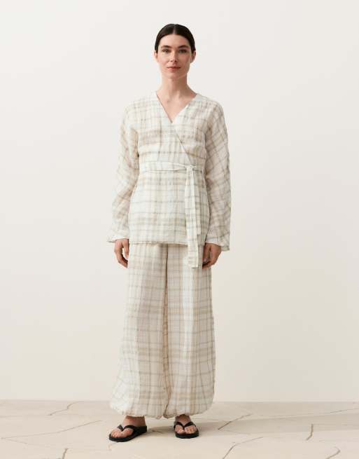 OYSHO – Kariertes Kimono-Hemd aus 100% Leinen in Beige