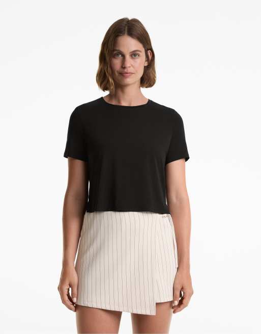 Oysho – Kurzärmliges Cropped-T-Shirt aus Lyocell-Mix in Schwarz