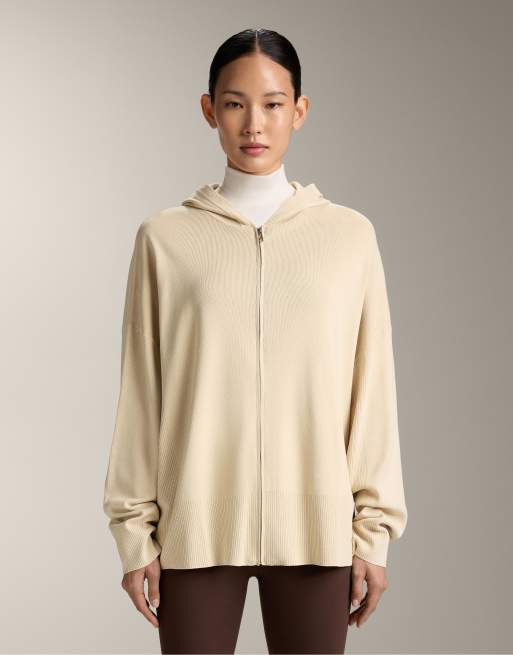 OYSHO – Lange Strickjacke in Beige mit Kapuze