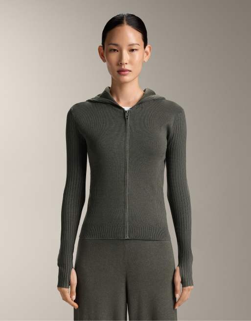 OYSHO – Slim-Fit-Strickjacke in Military-Grün mit Kapuze