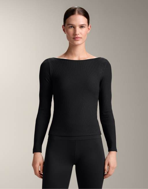 OYSHO – T-Shirt in Schwarz aus geripptem Modalmix mit U-Boot-Ausschnitt