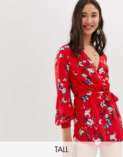 Parisian Tall – Kurzer, langärmlilger Jumpsuit in Rot geblümt