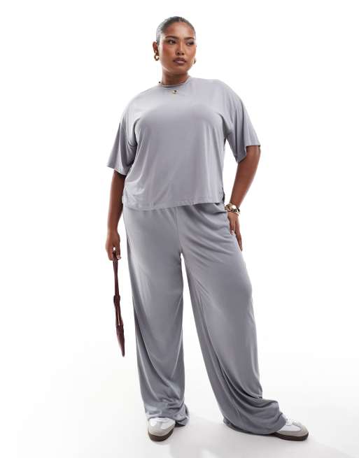 Pieces Curve – Figurbetontes Set aus superweichem kastigem T-Shirt und Hose mit weitem Schnitt in Grau