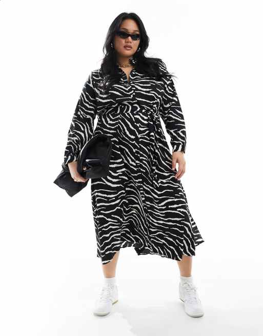 Pieces Curve – Midi-Hemdblusenkleid in Schwarz-Weiß mit Bindegürtel und Zebramuster