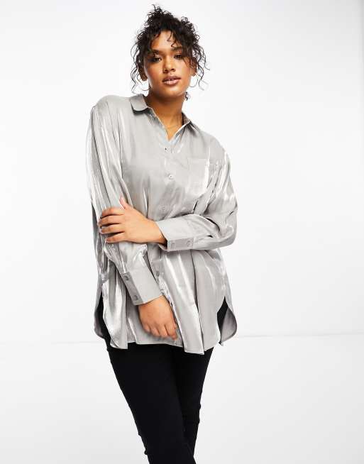 Pieces Curve – Oversize-Hemdbluse in Silber-Optik