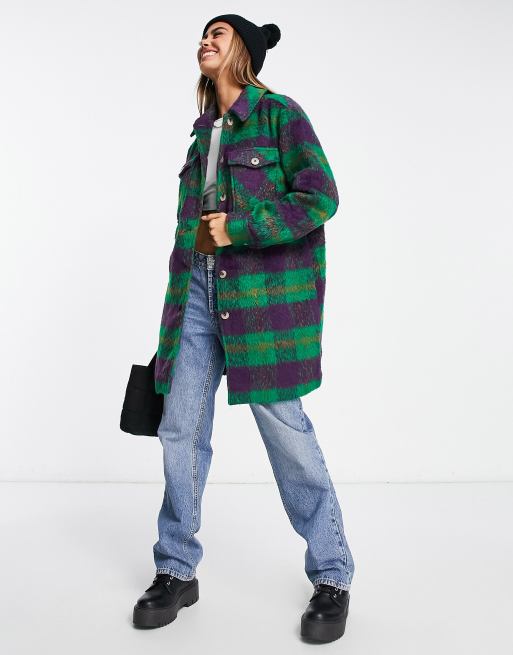 Pieces – Angeraute, schwere Longline-Hemdjacke mit Karomuster in Lila und Grün