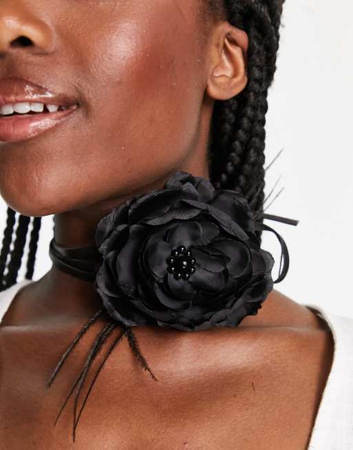Pieces – Eng anliegende Halskette in Schwarz mit Blumendetail