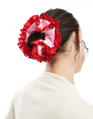 PIECES – Extragroßes Scrunchie-Haargummi in Rosa und Rot mit Rüschenrand