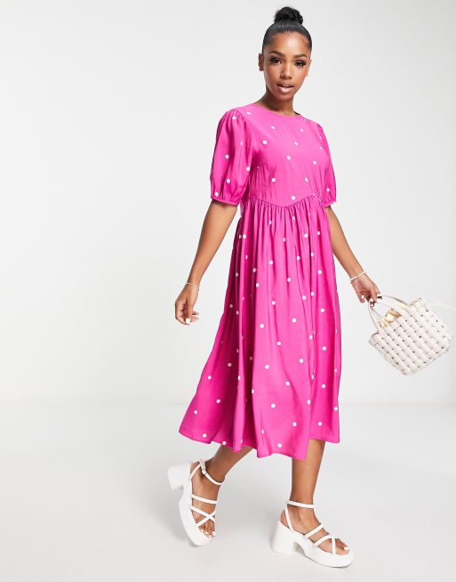 Pieces – Gepunktetes Midikleid in Pink mit Puffärmeln