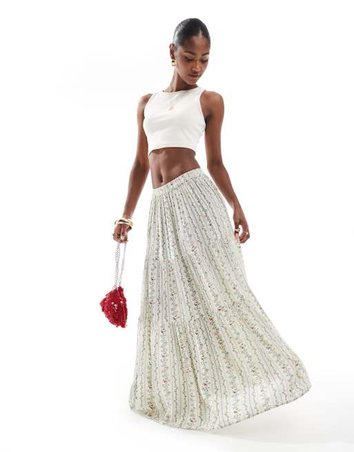 Pieces – Gestufter Maxi-Boho-Rock mit floralem Streifenmuster