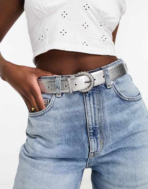 Pieces – Gürtel in Kroko-Silber mit Strass-Schnalle