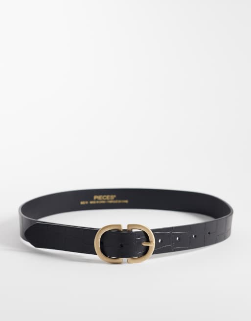 Pieces – Gürtel in schwarzer Kroko-Optik mit zwei goldenen Schnallen