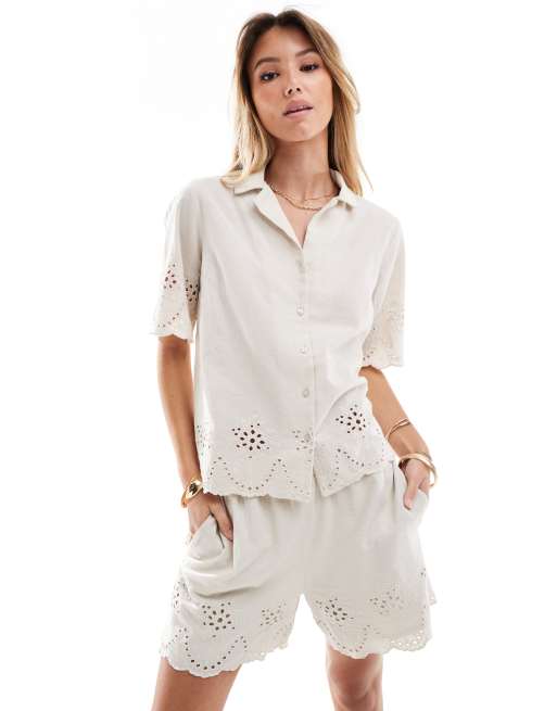 Pieces – Hemdbluse in Cremeweiß mit Lochstickerei, Kombiteil