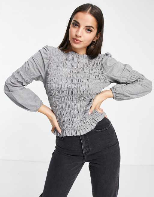 Pieces – Hochgeschlossene, gesmokte Bluse in Grau