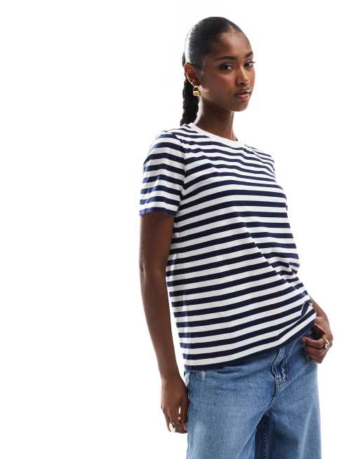 Pieces – Kastiges, gestreiftes T-Shirt in Blau und Weiß