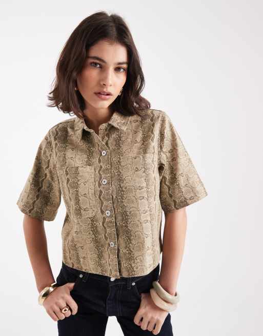 Pieces – Kurzärmliges Cropped Jeans-Oberteil mit Schlangenmuster