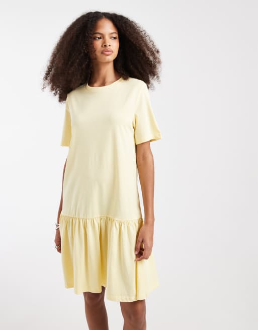 Pieces – Kurzärmliges Minikleid in Blassgelb mit tiefer Taille