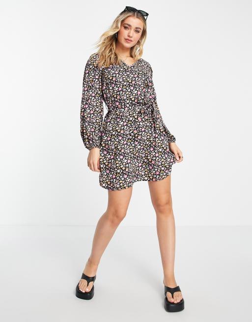 Pieces – Langärmeliges, gestuftes Mini-Smokkleid mit Blumendruck