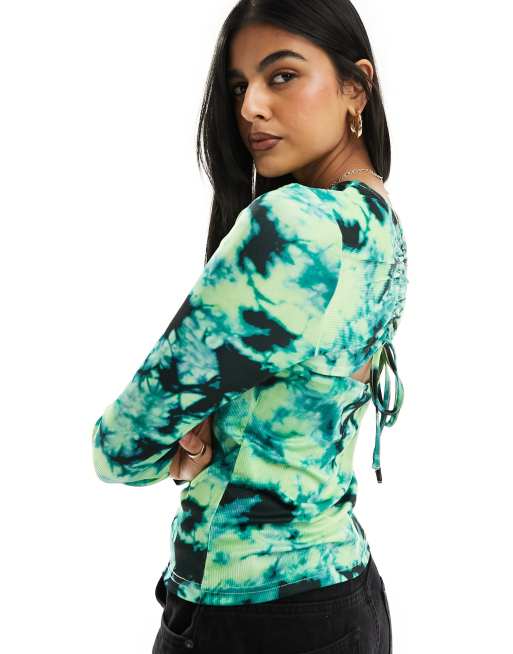Pieces – Langärmliges Jersey-Oberteil mit Batikaufdruck in Blau