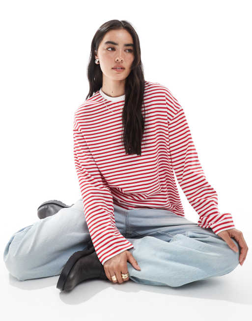 Pieces – Langärmliges, superweiches T-Shirt in gestreiftem Rot