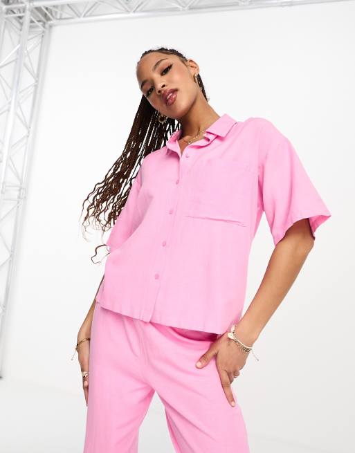 Pieces – Leinen-Hemdbluse in Rosa mit Zweiviertelärmeln, Kombiteil