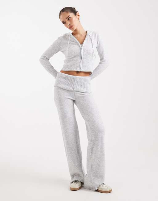 Pieces – Lounge-Set aus Strick in meliertem Hellgrau, bestehend aus Kapuzenpullover und Schlaghose mit Umschlagbund