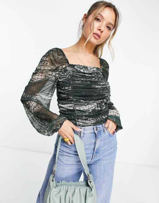 Pieces – Oberteil aus Netzstoff in Grün mit Tiermuster und eckigem Ausschnitt