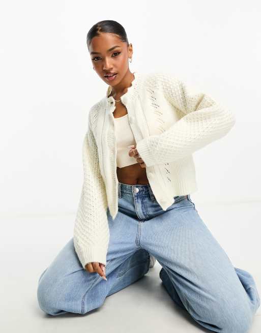Pieces – Strickjacke in Cremeweiß mit Besatz in Spitzen-Optik
