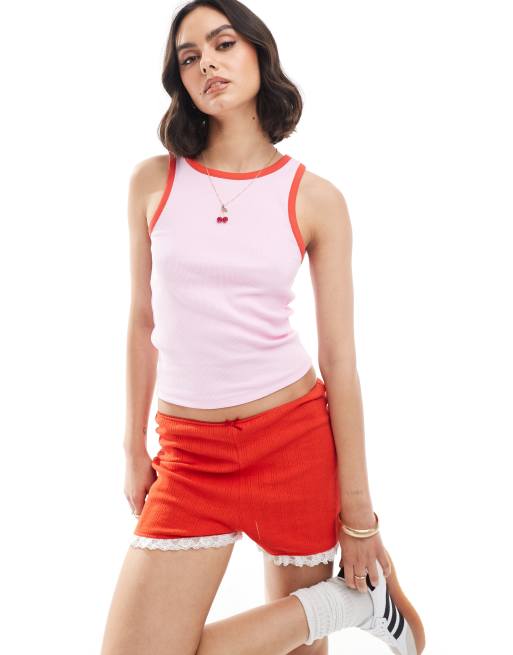 Pieces – Tanktop in Rosa mit Kontrastbesatz in Rot