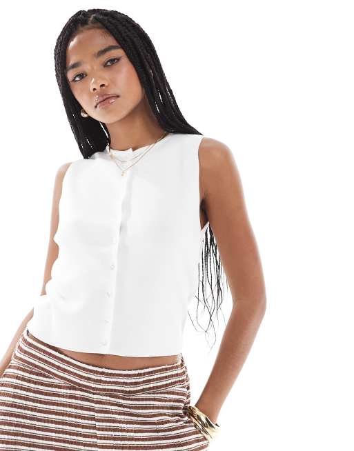 Pimkie – Ärmelloses Feinstrick-Oberteil in Weiß mit durchgehender Knopfleiste