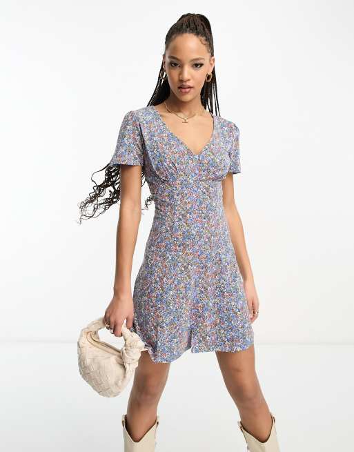 Pimkie – Geknöpftes Mini-Freizeitkleid mit Blumenmuster in Blau