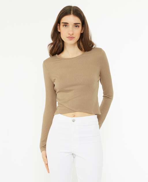 Pimkie – Geripptes Wickeloberteil in Taupe mit Ziernaht