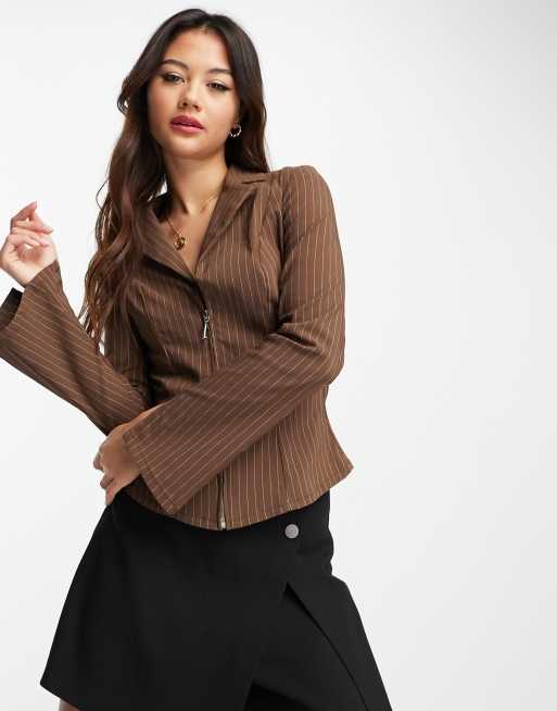 Pimkie – Hemd in Braun mit weiten Ärmeln, Reißverschluss und Nadelstreifen, Kombiteil