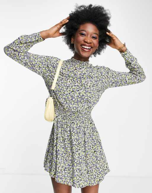 Pimkie – Hochgeschlossenes Minikleid in Lila mit Blumenmuster und gesmokter Taille