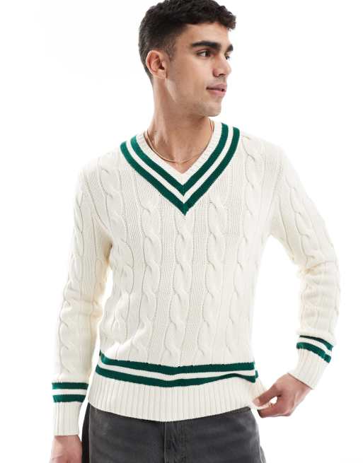 Polo Ralph Lauren – Cricket-Strickpullover aus Baumwolle in Cremeweiß/Dunkelgrün mit V-Ausschnitt und Zopfmuster