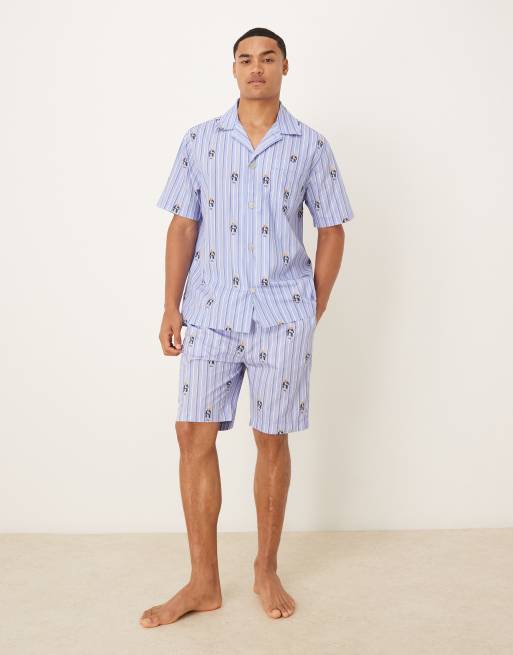 Polo Ralph Lauren – Gestreifter Pyjama in Blau mit Bear-Print und kurzärmligem Hemd und Shorts