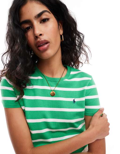 Polo Ralph Lauren – Kurzärmliges Strickoberteil mit grünen Streifen und Polospieler-Logo