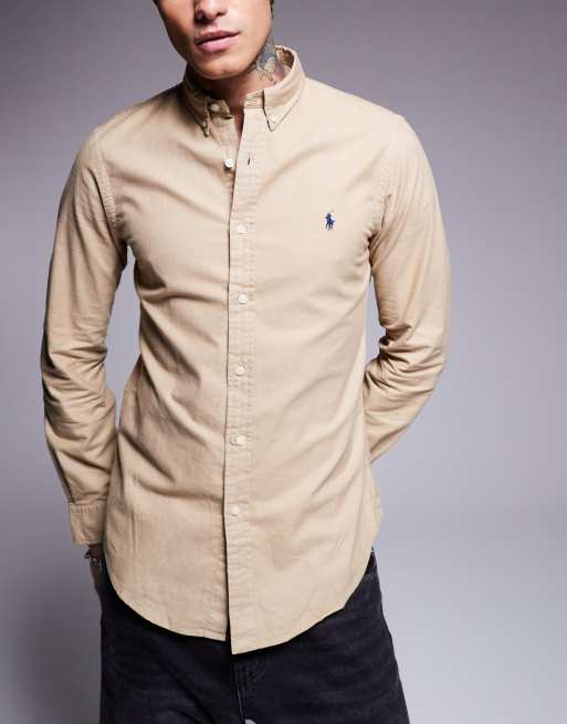 Polo Ralph Lauren – Stückgefärbtes Oxford-Hemd in Hellbraun mit schmalem Schnitt und Markenlogo