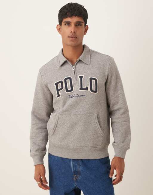Polo Ralph Lauren – Sweatshirt in meliertem Dunkelgrau mit halblangem Reißverschluss und großem College-Logo-Schriftzug