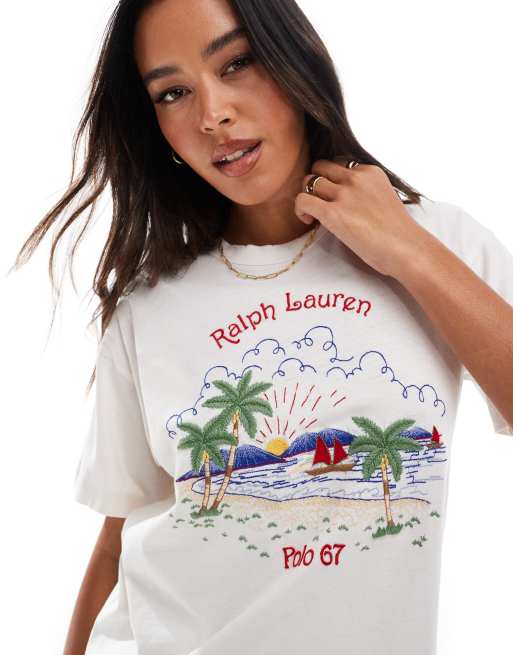 Polo Ralph Lauren – T-Shirt in Cremeweiß mit Palmenprint und Logo auf der Brust