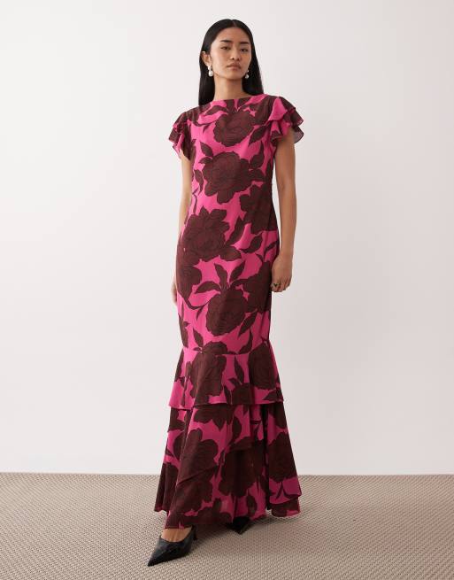 Pretty Lavish – Chiffon-Maxikleid in Rosa mit braunem Blumenmuster und Rüschenärmeln