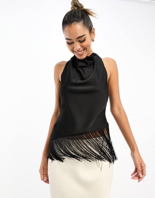Pretty Lavish – Hochgeschlossenes, kurzes Satinoberteil in Schwarz mit Fransen