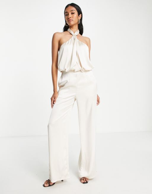 Pretty Lavish – Jumpsuit aus Satin in Austernbeige mit verdrehtem Ausschnitt
