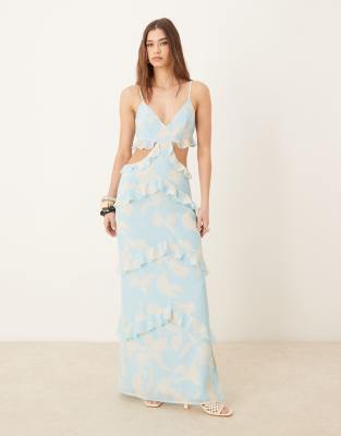 Pretty Lavish – Maxikleid in Blau mit übergroßem Blumenmuster, Zierausschnitt und Rüschen