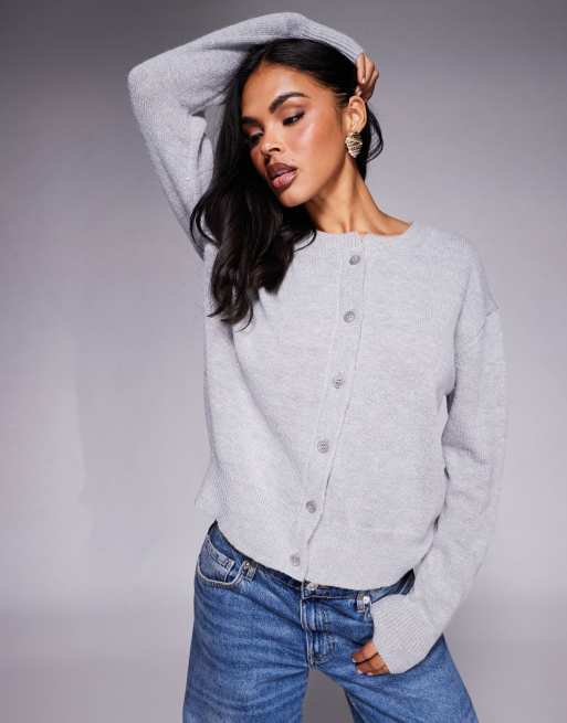 Princess Polly – Melancholia – Strickjacke in Hellgrau mit durchgehender Knopfleiste sowie Bündchen und Saum aus Rippstrick