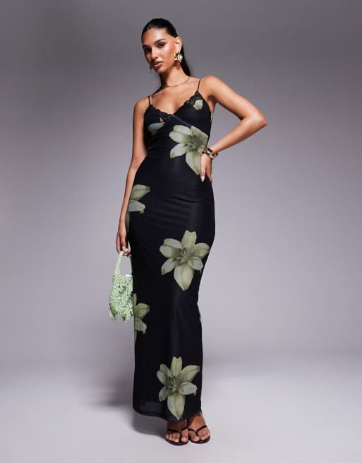 Princess Polly – Stardrop – Bodycon-Camisole-Maxikleid aus Mesh in Schwarz und Grün geblümt mit Spitzenborte