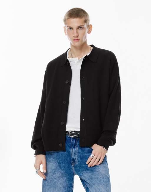 Pull&Bear – Bedruckte Strickjacke in Schwarz mit Polokragen
