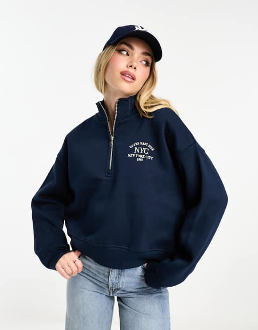 Pull&Bear – College-Sweatshirt in Marineblau mit kurzem Reißverschluss
